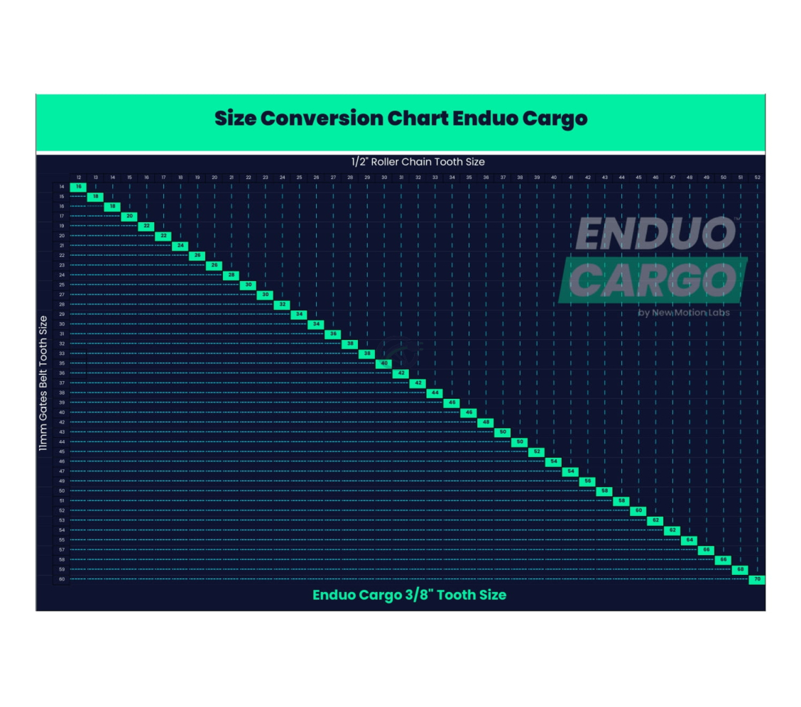 Het is wel zo, dat het afwijkende aantal tanden en de afwijkende kettingsteek het onduidelijker maken welke tandwielgrootte uw nodig heeft als vervanging. Ook als u op het moment een riemaandrijving heeft die u probeer te vervangen is het al snel onduidelijk voor welke tandwielgroottes u dan moet gaan. Om dit gemakkelijker te maken vindt u hieronder een conversie schema waarop u kunt zien welke tandwielgrootte geschikt is voor uw elektrische fiets. Op de horizontale as ziet u de tandwielgroottes die horen bij een gebruikelijke ketting met kettingsteek 3/8''. Als u bovenaan vanuit de juiste grootte van het tandwiel dat u probeert te vervangen recht naar beneden beweegt, vindt u de juiste grootte Enviolo Bosch Enduo Cargo tandwielen om uw originele tandwiel mee te vervangen. Op de verticale as ziet u de groottes die horen bij een riemaandrijving. Als u links vanuit de juiste grootte van de riem die u probeert te vervangen naar rechts beweegt, vindt u de juiste grootte Enviolo Bosch Enduo Cargo tandwielen om uw originele riemaandrijving te vervangen. Twijfelt u of deze Enviolo Bosch Enduo Cargo Set de juiste grootte heeft om uw oude aandrijving te vervangen? Neemt u dan gerust contact op met onze klantenservice. Zij helpen u graag! Het is overigens niet onmogelijk om uw huidige tandwiel te vervangen door een groter of kleiner tandwiel, maar het kan wel ietswat ten kosten gaan van de prestatie van uw e bike als u niet dezelfde tandwielgrootte aanhoudt.