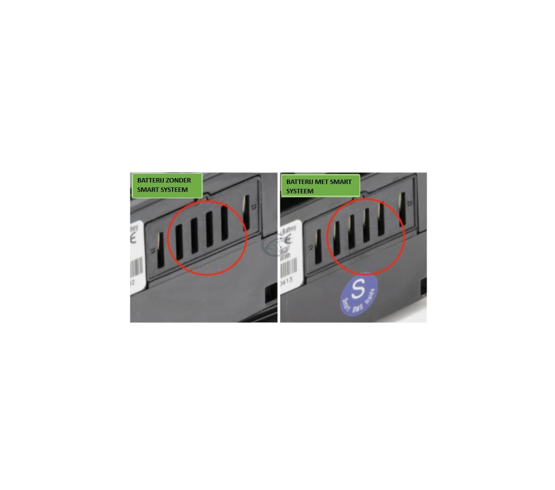 U kunt aan de metalen connectors die in de aansluiting voor de fiets zitten, zien of uw fietsaccu een SMART systeem heeft of niet. Enkel de SMART fietsaccu's hebben ook in de middelste vier poorten metalen connectors zitten. Daarnaast hebben de accu's met SMART systeem meestal een sticker, waar SMART BMS opstaat (zie de blauwe sticker op de rechter afbeelding), onder de connector poort.